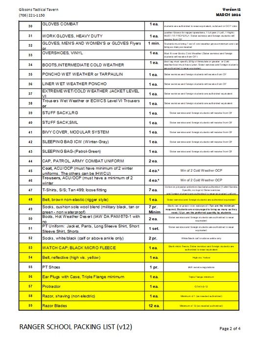Gibsons Ranger Ready Pack based on Ranger School Packing List v.12 (Mar-2026) *GRP*