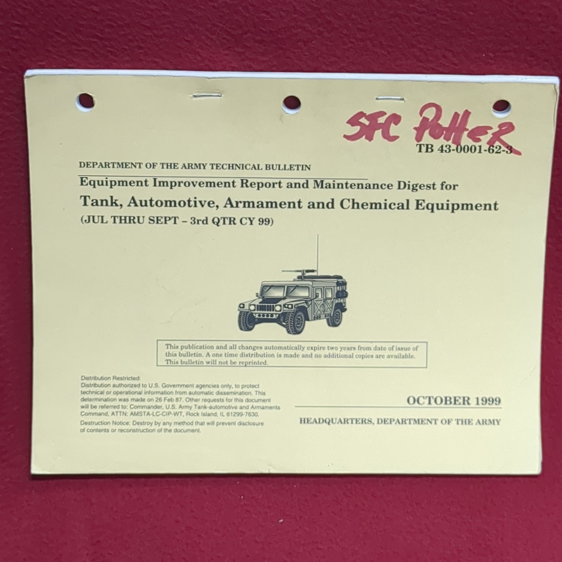 BOOK - DEPARTMENT OF THE ARMY; TECHNICAL BULLETIN5: EQUIPMENT IMPROVEMENT REPORT AND MAINTENANCE DIGEST FOR TANK, AUTOMOTIVE, ARMAMENT AND CHEMICAL EQUIPMENT (JULY THROUGH SEPTEMBER-3RD QUARTER CY 99) OCTOBER 1999 (BOX27)