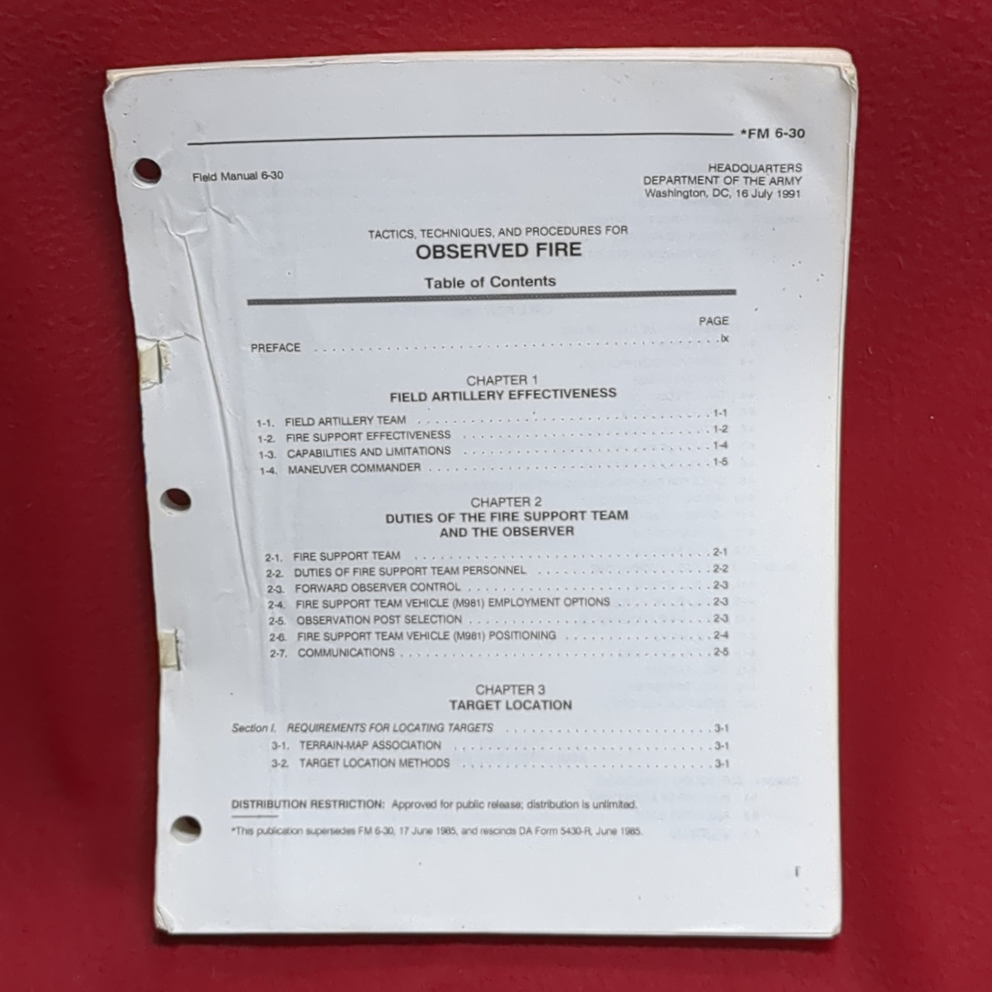 BOOK - HEADQUARTERS, DEPARTMENT OF THE ARMY: FIELD MANUAL: TACTICS, TECHNIQUES, AND PROCEDURES FOR OBSERVED FIRE JULY 1991 ( FM 6-30) (BOX 29)