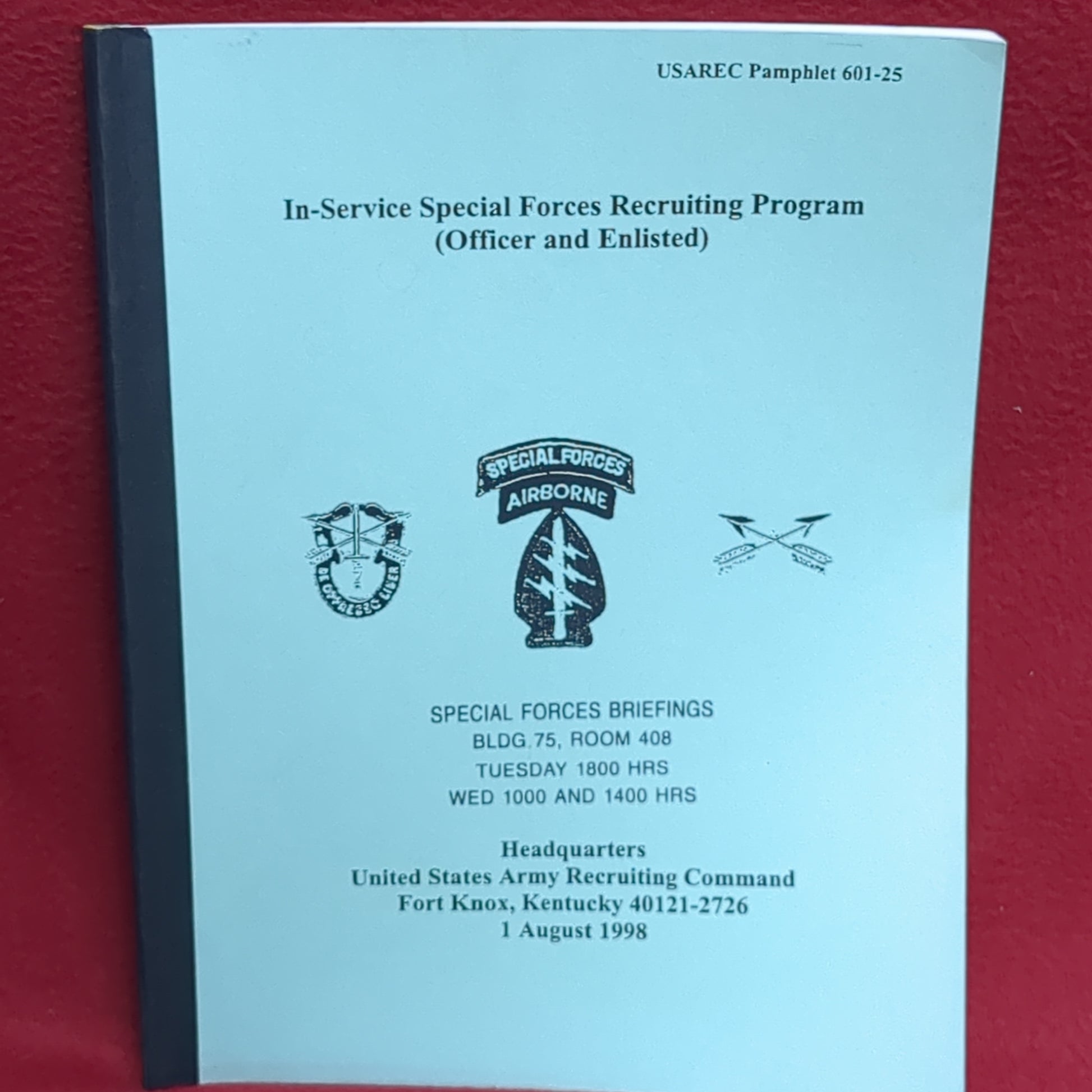 BOOK - USAREC PAMPHLET 601-25: IN-SERVICE SPECIAL FORCES BRIEFINGS: BLDG 75, ROOM 408: TUESDAY 1800 HRS: WEDNESDAY 1000 AND 1400 HRS 1 AUGUST 1998 (BOX 28)